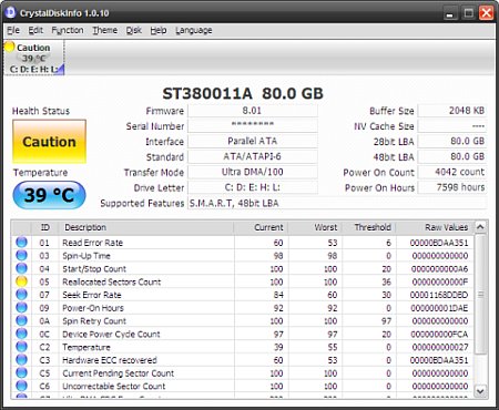 Отслеживает состояние жестких дисков, поддерживающих технологию S.M.A.R.T. Производит мониторинг и дает общую оценку "здоровья" вашего диска. CrystalDiskInfo отображает детальную информацию о жестких дисках, установленных в компьютере (прошивка, серийный номер, стандарт, интерфейс, общее время работы и др.), а также выводит параметры атрибутов системы самодиагностики S.M.A.R.T. (ошибки чтения, производительность, запуски/остановки шпинделя, время поиска дорожки, количество циклов включения-выключения, ошибки секторов и многое другое). This application was designed to help you view details about your hard disk drive. The CrystalDiskInfo application was designed to help